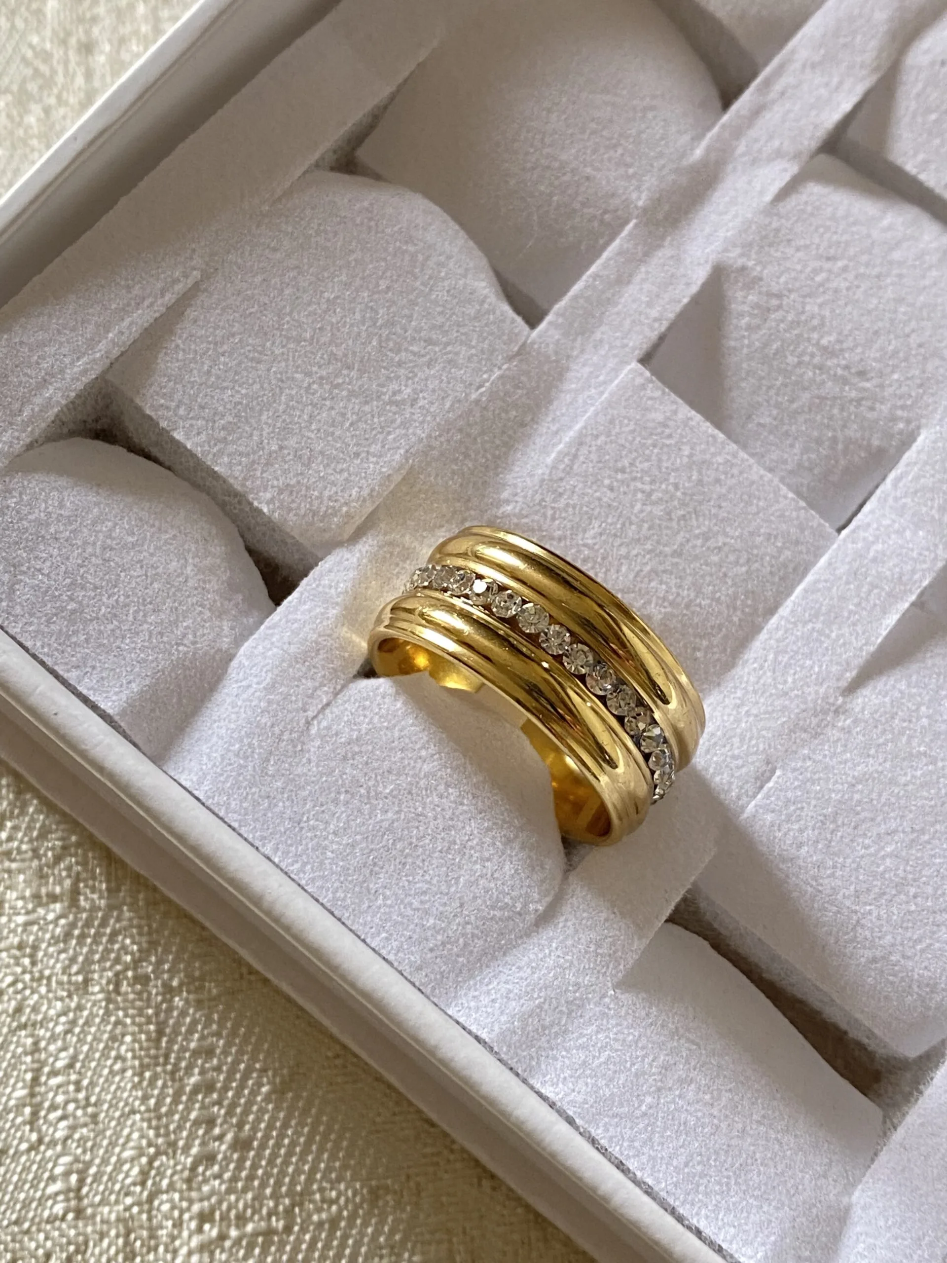 Elevate your everyday elegance with the stainless steel Solara ring — a timeless, tarnish free piece crafted for the modern muse. This bold gold band features a sleek, polished finish and a radiant line of handset crystals that catch the light with every movement.