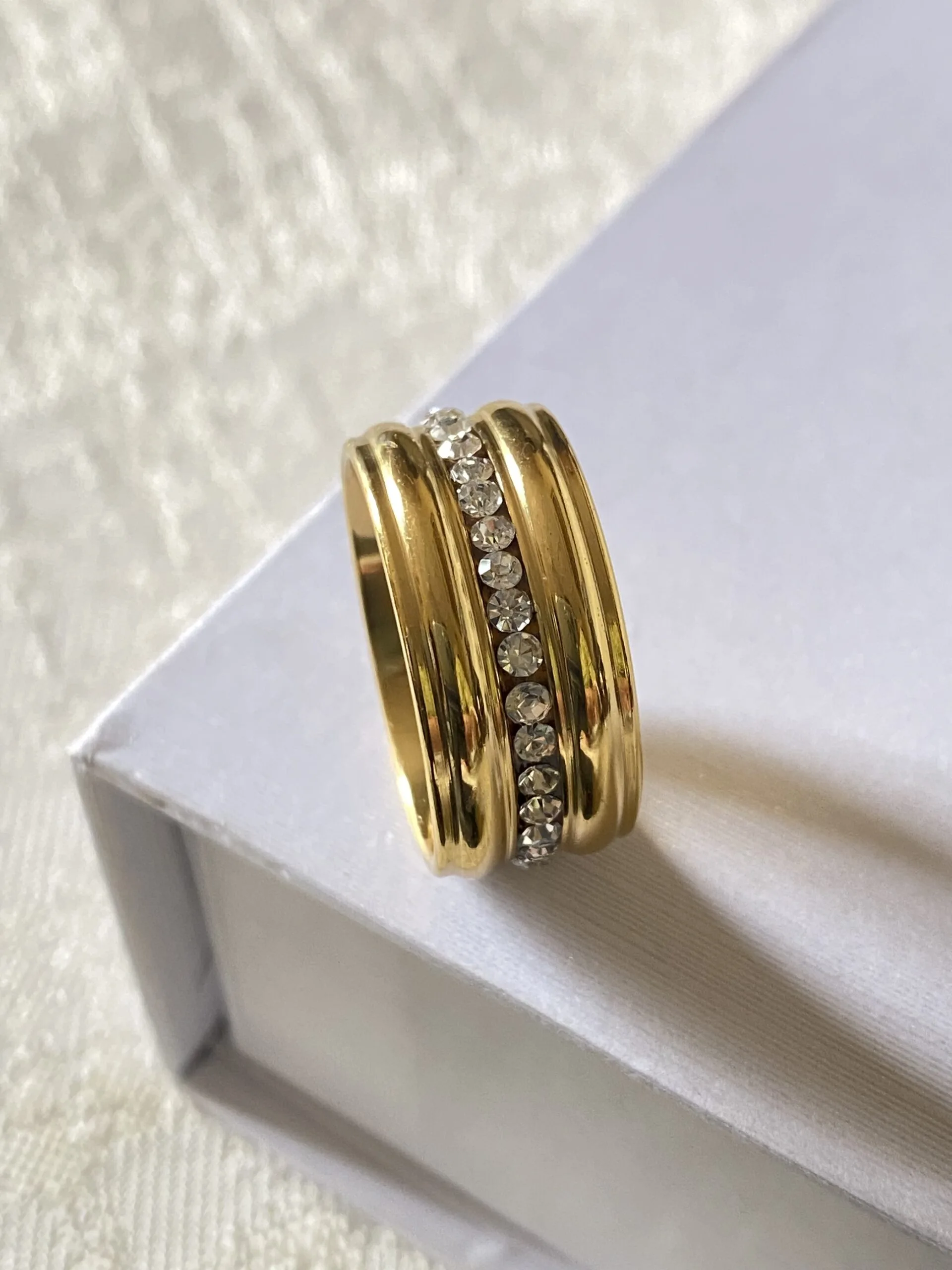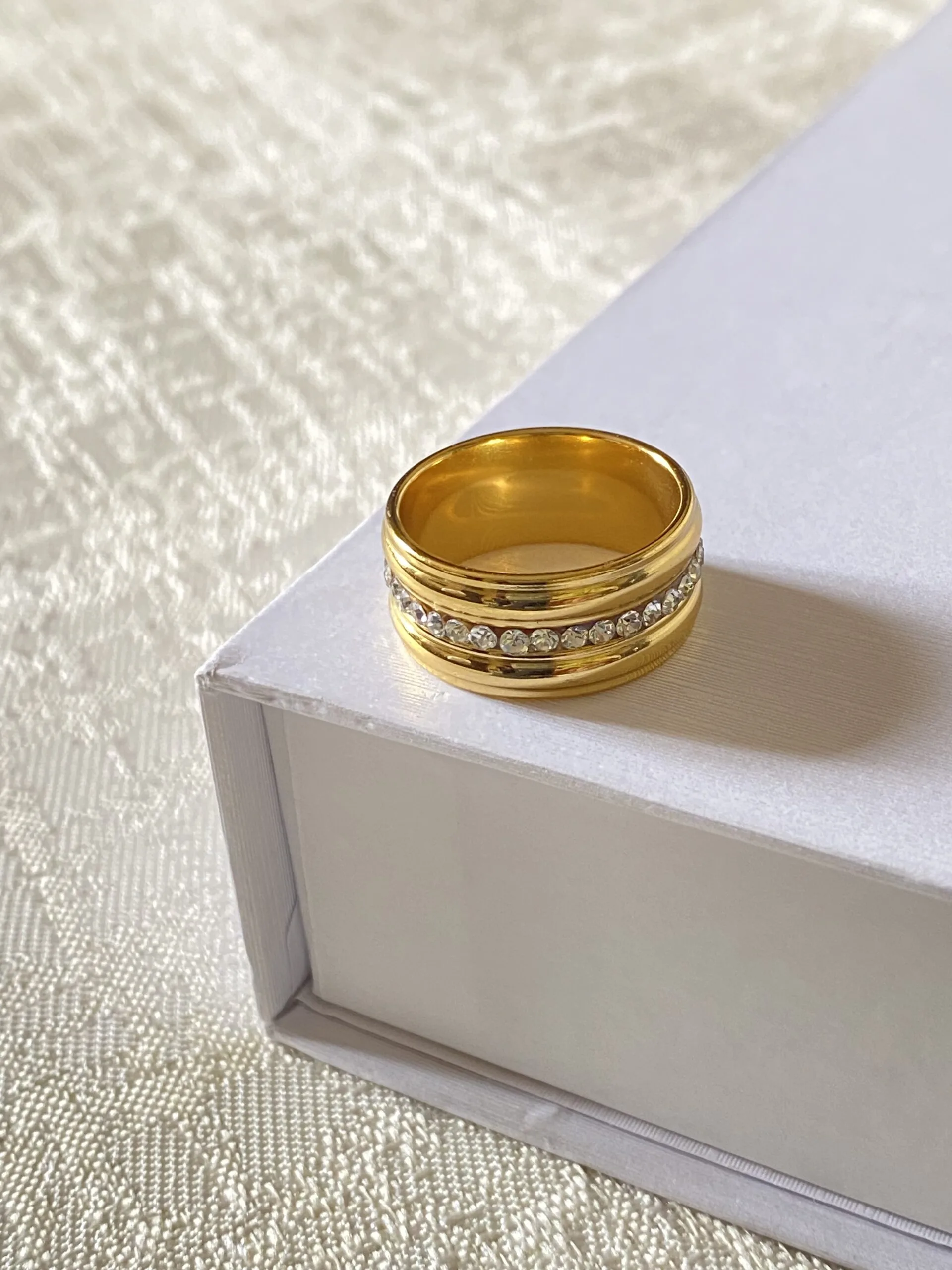 Elevate your everyday elegance with the stainless steel Solara ring — a timeless piece crafted for the modern muse. This bold gold band features a sleek, polished finish and a radiant line of handset crystals that catch the light with every movement.
